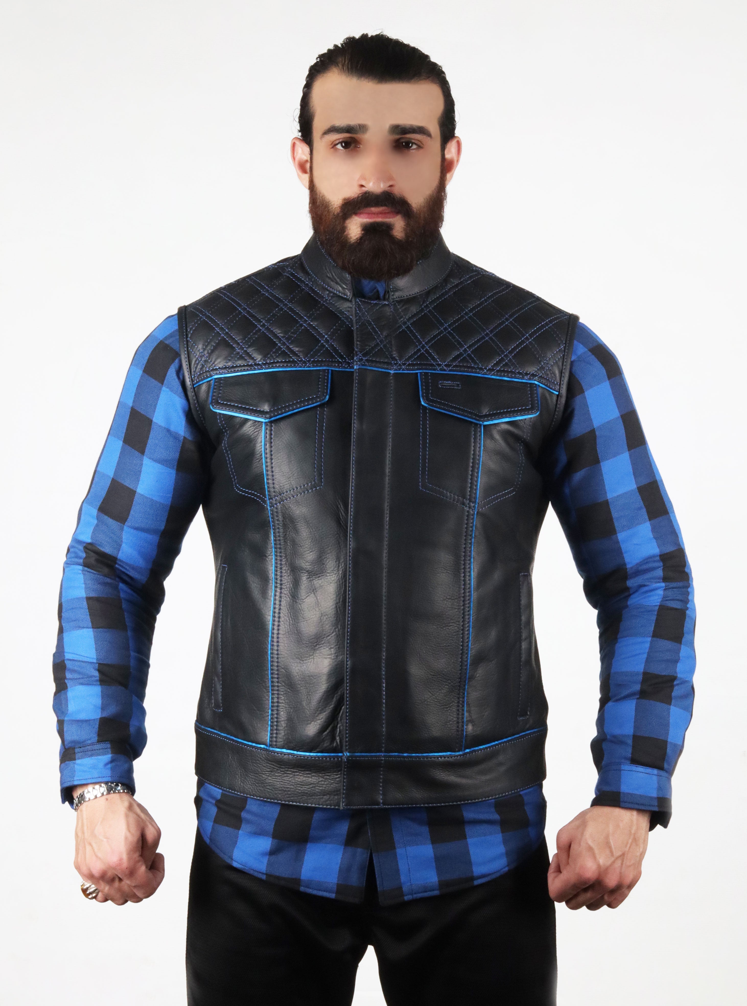 Engineered for performance and designed with precision, this men’s black and blue motorcycle vest is the perfect fusion of rugged functionality and contemporary style. Constructed from premium-grade leather, the vest features deep blue accents and contrast stitching that highlight its sleek, structured profile. The diamond-quilted pattern across the shoulders enhances both durability and visual appeal, making it a standout choice for discerning riders.